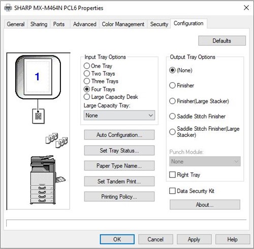 Bảng Properties xuất hiện, Chọn tab "Configuration", tại mục "Input Tray Options" chọn "Four Trays" Sau đó nhấn Apply và chuyển qua tab "General" |