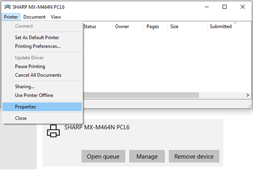 Tại “Printers & scanners” chọn máy in vừa cài đặt (SHARP MX-M464N PCL6) và chọn “Open queue” |